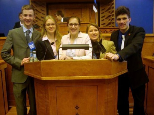 Šilutiškė gimnazistė Solveiga Bendžiūtė (stovi viduryje) tarptautinėje mokomojo Europos Parlamento sesijoje Taline. Nuotrauka Šilutės pirmosios gimnazijos