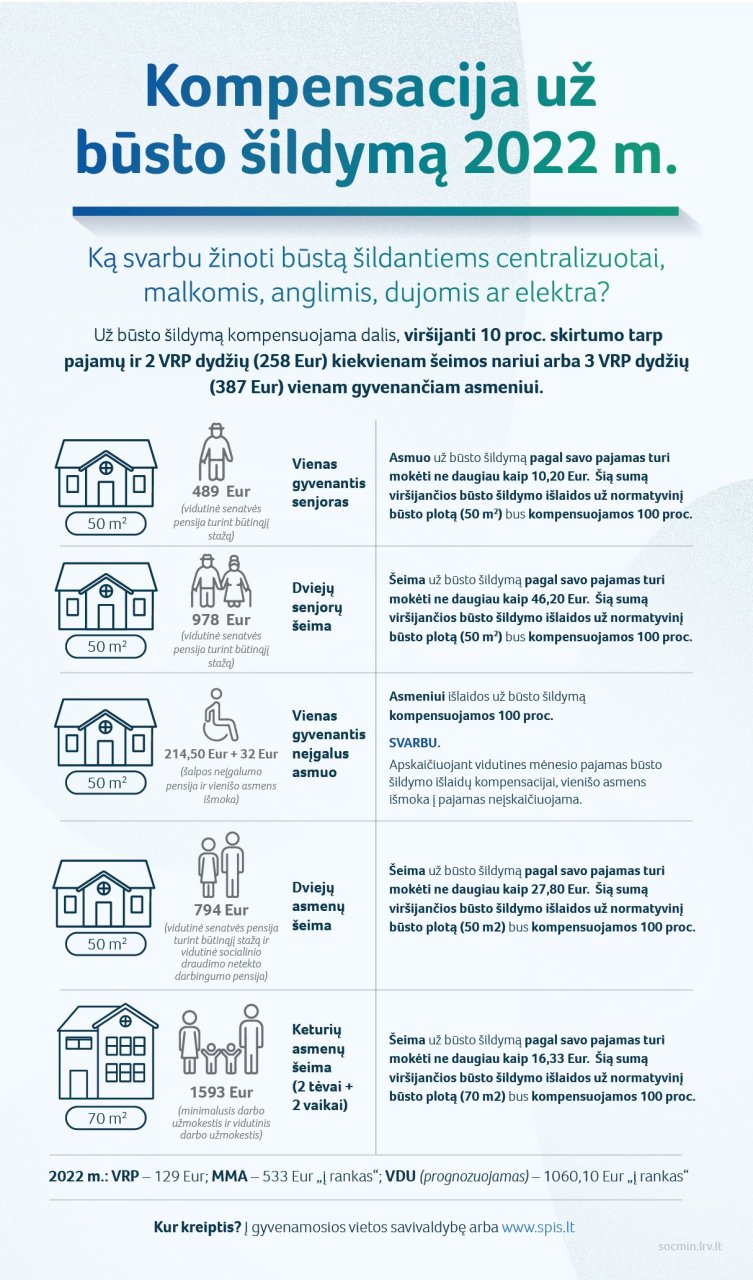 Nuo šių metų pradžios nepasiturintiems gyventojams už būsto šildymą kompensuojama dalis, viršijanti 10 proc. skirtumo tarp pajamų ir 2 valstybės remiamų pajamų dydžių (2 VRP – 258 Eur) kiekvienam šeimos nariui arba 3 valstybės remiamų pajamų dydžių (3 VRP – 387 Eur) vienam gyvenančiam asmeniui.