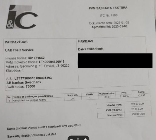 Pagal sąskaitas matyti, kad už šią sumą Plikšnienė nuo 2020 rugpjūčio nuomojosi kompiuterinę įrangą iš bendrovės “IT&C Service”.