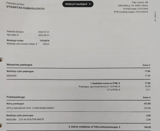 O Teliai nuo 2021 metų pabaigos po 137 eurus už nusipirktą kompiuterį Apple McBook Pro.