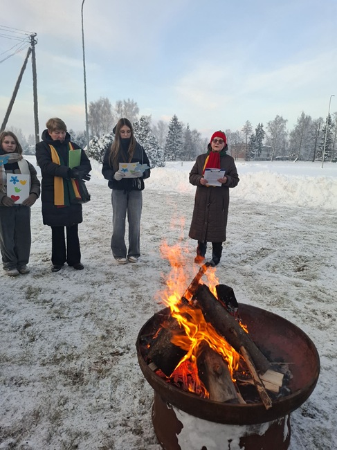 Į šaltą baltą erdvę nuvilnijo prasmingi posmai apie laisvę ir Lietuvą, skaitomi Stoniškių vaikų dienos centro auklėtinių ir jų vadovės Laimos Bagdonienės. Jaunimas prie laužo atskubėjo tiesiai iš mokyklų, po įsimintinos istorijos pamokų.