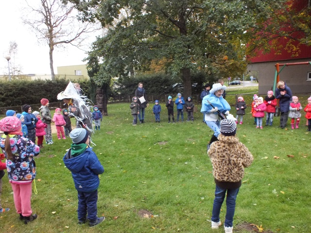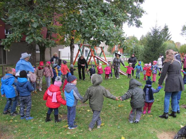 Ketvirtadienio rytą, padūkėliai Vėjelis ir Lietutis (auklėtojos Regina ir Rima) pakvietė vaikučius ir jų tėvelius linksmai pasisukti žaidimų ir dainelių karuselėje. Rudens traukinuku vaikai vyko pas daržo šeimininką Kiškį (auklėtoja Irena), o paskui ir pas miško urėdą Ežiuką (auklėtoja Nijolė). Kelionėje vaikai turėjo atlikti įvairias užduotis, minti mįsles apie daržoves vaisius, miško gėrybes, deklamuoti eilėraščius ir dainuoti daineles. Už šaunius pasirodymus Vėjelis vaikučiams dovanojo pintinę raudonų obuolių, o kiškis su ežiuku – morkų.