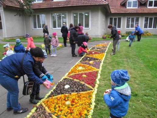 Po linksmų žaidimų visi skubėjo prie surinktų miško, daržo ir sodo gėrybių maišų, nes laukė nelengva, bet labai kūrybiška ir linksma užduotis- „išausti“margą rudens juostą ir jai saugoti sukurti linksmus moliūgų sargybinius. Visų vaikučių, jų tėvelių ir darbuotojų pastangomis, juosta sušvito ryškiomis nuostabaus rudenėlio spalvomis ir traukė ne tik pačių kūrėjų, bet ir praeivių akis, kviesdama užsukti pro darželio vartelius.