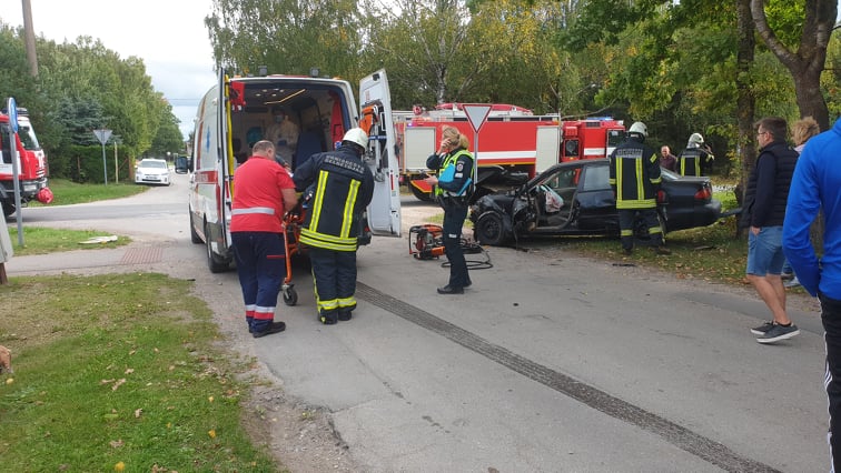 Susidūrus dviem automobiliams ugniagesiai vadavo keleivę Susidūrus dviem automobiliams ugniagesiai vadavo keleivę