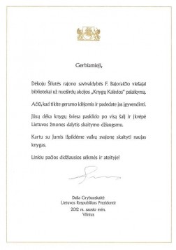 Sausio 16 d. F. Bajoraičio viešajai bibliotekai įteikta Lietuvos Respublikos Prezidentės Dalios Grybauskaitės padėka už „Knygų Kalėdų“ akcijos palaikymą.