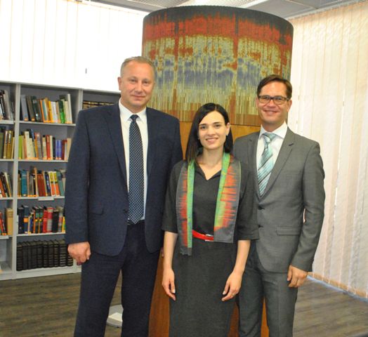 - (Iš kairės): Pagėgių savivaldybės meras Virginijus Komskis, Pagėgių savivaldybės viešosios bibliotekos direktorė Milda Jašinskaitė-Jasevičienė ir tarpdisciplininių menų kūrėjas Julius Žėkas.