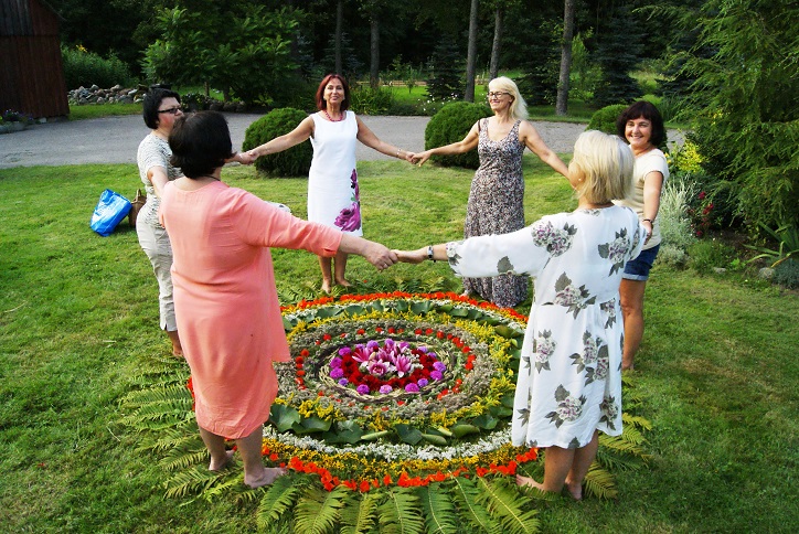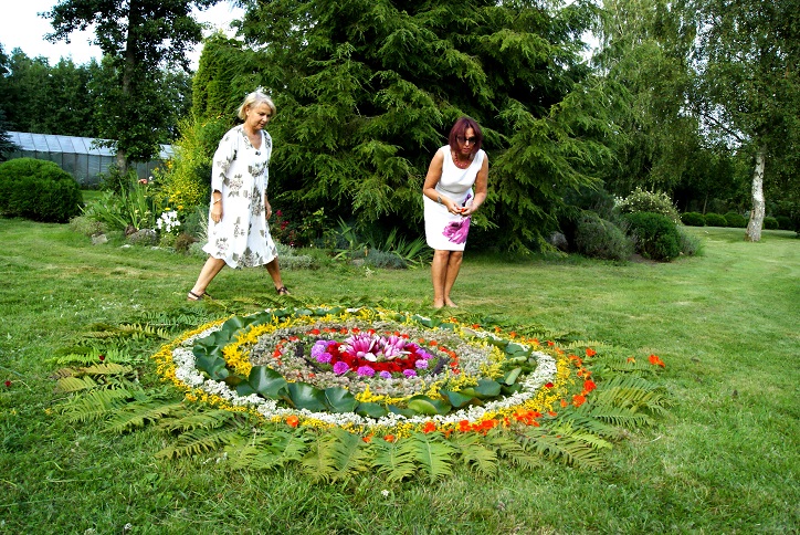 Trumpai aptarusios darbų eigą, vėl patraukėme į pievą rinkti žiedų gėlių kompozicijai. Iš pievų ir darželio gėlių, lapų, javų varpų sukūrėme apskritimo formos geometrinę kompoziciją, simboliškai vaizduojančią dvasinę ir kosminę tvarką. Kompozicijos centrą papuošėme penkiomis vandens lelijomis. Taip septintąjį kartą, susirinkusios Povilų kaime, Kintų seniūnijoje, pas bičiulę Virginiją, atsisveikinome su vasara.