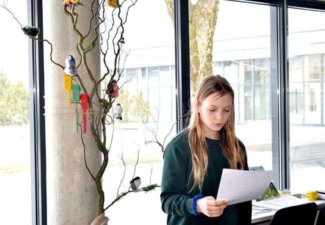 Šį rytą biblioteka kvepėjo ne tik knygomis, bet ir kūryba. Ketvirtokai įrodė, kad gražiausia puošmena mūsų šaliai yra ne kas kita, o skambus lietuviškas žodis. Skaitydami eiles apie gimtinę, Lietuvą, jūrą, lietutį, zylutę ir kt., vaikai savo potyrius čia pat perkėlė ant popieriaus lapų – eilėraščių posmai pražydo spalvingomis iliustracijomis, tapdami mažais meno kūriniais.