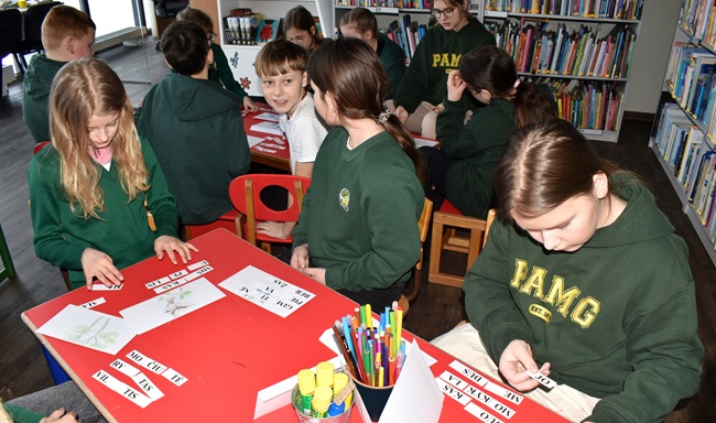 Vėliau jaunieji skaitytojai aktyviai „kibo“ į kalbinę užduotį: iš pabirusių kortelių dėliojo gražiausius žodžius Lietuvai. „Laisvė“, „gimtinė“, „ąžuolas“, „gerumas“, „meilė“ – tai žodžiai, kuriais mokiniai simboliškai papuošė savo Tėvynę.