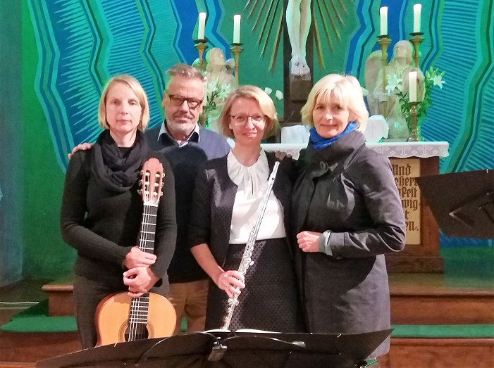 Katja Vonhausen (gitaristė), Uwe Meyer, ilgametis Neringos – Fehmarno draugystės komiteto pirmininkas, Kathrin Kark (fleitininkė) ir svečio žmona Raimonda Meyer-Ravaitytė. Nuotraukos Birutės Morkevičienės