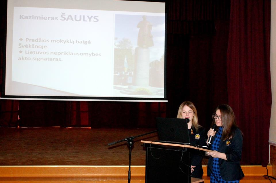 Švėkšnoje, Lietuvos gimtadienio šventė, kaip ir kasmet, prasidėjo Stemplėse. Tradiciškai Stemplių kaimo bendruomenė, Švėkšnos skautai ir keletas švėkšniškių rinkosi prie stogastulpio, žyminčią buvusią kraštiečio, vasario 16-osios akto signataro K. S. Šaulio gimtinės vietą. Čia padėta atminimo gėlių puokštė, parvežta iš Prezidentūros. Šiemet jos parvežti kartu su Švėkšnos seniūnu Alfonsu Šepučiu į Prezidentūrą važiavo Šilutės r. sav. nariai Antanas Martinkus bei Arūnas Kurlianskas. Iškilmingai padėjus LR prezidentės Dalios Grybauskaitės perduotą atminimo gėlių puokštę prie signataro koplytstulpio, visi susirinkusieji pajudėjo link Švėkšnos, kur Šv. Jokūbo bažnyčioje buvo aukojamos Šv. Mišios. Po Šv. Mišių ankstyvą, saulėtą ir pavasarišką popietę, Švėkšnos „Saulės“ gimnazijos aktų salėje prasidėjo iškilminga konferencija-minėjimas „Kaimyninių kultūrų sankirtos reikšmė asmenybės formavimui“, joje pranešimus skaitė: muziejininkė iš Šilutės H. Šojaus muziejaus Asta Bartkevičiūtė – pranešimas „Lietuvininkų krašto įdomybės“, Švėkšnos „Saulės“ gimnazijos moksleiviai R. Žilius ir L. Lukomskis – pranešimas „100 metų Lietuvai – 100 metų gimnazijai: tai daug ar mažai?“ bei gimnazistės D. Freitikaitė ir D. Bergelytė – pranešimas „Šimtmečio gimnazijos perlai: žmonės, garsinantys Švėkšną“, mokinius ruošė istorijos mokytoja Daiva Vileikienė. Teoriškai susipažinus su kaimynų panašumais bei skirtumais, su gera nuotaika bei emocijomis buvo įsilieta į šventinę programą, kurioje Žemaitijos regioną reprezentavo šokių kolektyvas „Šalna“, o Mažąją Lietuvą atstovavo folkloro ansamblis „Verdainė“. Po žemaitiškų šokių ir lietuvininkų dainų, visi susirinkę buvo pakviesti ragauti Žemaitijos bei Mažosios Lietuvos skanėstų bei gėrimų.