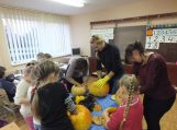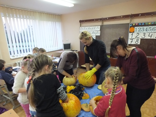 Ketvirtadienį 1-10 klasės virto kūrybinių darbų dirbtuvėmis. Visi plušėjo prie atsineštų moliūgų su šaukštais, gremžtukais bei peiliukais. Įdomiausia buvo stebėti ir matyti, kaip išradingai išskobtuose moliūguose, ryškėja įvairiausi veidai. Daugiau nei dešimt moliūgų- žibintų paruošė parodai antrokai, trečiokai, penktokai, septintokai.