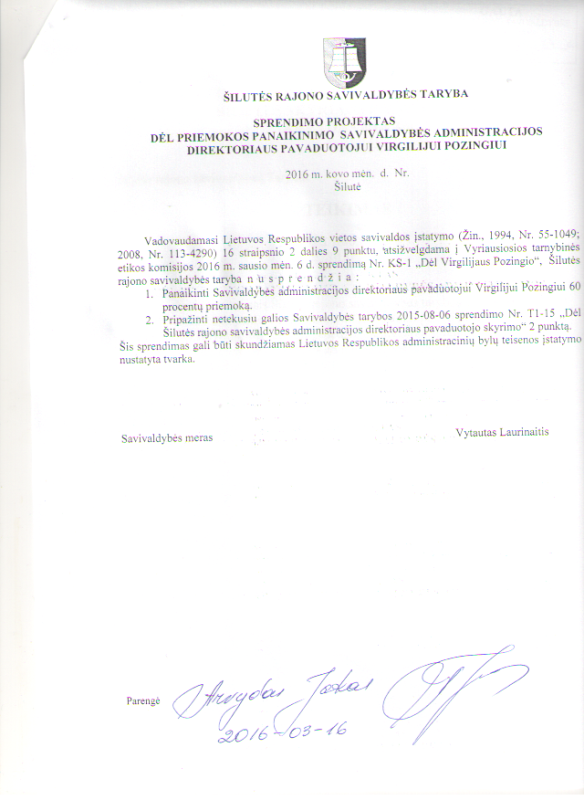 Šilutės rajono savivaldybės administracijos direktoriaus pavaduotojui Virgilijui Pozingiui pažeidus Viešųjų ir privačių interesų derinimo valstybinėje tarnyboje įstatymo reikalavimus, buvo bandoma jį atstatydinti iš užimamų pareigų. Nepavykus, Tarybos opozicija nenuleidžia rankų ir suklydusį valdininką siekia nubausti atimant jam šiuo metu mokamą 60-ies procentų atlyginimo dydžio priedą prie algos už įprastą darbo krūvį viršijančią veiklą.