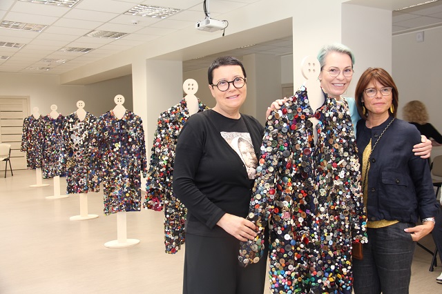 Parodų salės sienas papuošė emigrantų šeimose gimusių kūdikių drabužėliai, siuvinėti sagomis, dukters sukurtas sagų kaklaraištis tėveliui, kuris darbuojasi užsienyje. Švedijoje gyvenanti meilės emigrantė iš Panevėžio Ligita Umantė-Butkuvienė dekoravo sagomis aukštakulnius.