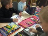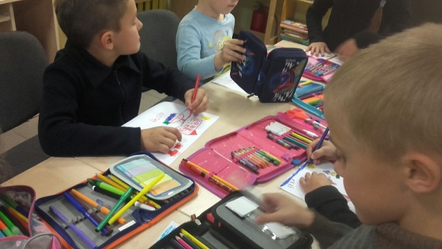 Bibliotekininkė Regina Juškienė pasiūlė vaikams nupiešti piešinį, o ant piešinio užrašyti savo vardą ir pažadėjo paruošti šių piešinių parodą bibliotekoje.
