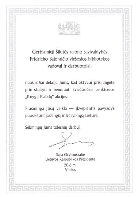 Lapkričio 16 – sausio 6 dienomis vyko jubiliejinė, penktoji, akcija „Knygų Kalėdos“, keliavusi per visą Lietuvą ir kvietusi skaityti bei dovanoti vaikų ir jaunimo knygas bibliotekoms. Lietuvos Respublikos Prezidentė Dalia Grybauskaitė Šilutės rajono savivaldybės Fridricho Bajoraičio viešajai bibliotekai pareiškė padėką už tai, kad kasmet prisijungia ir aktyviai dalyvauja šioje akcijoje.