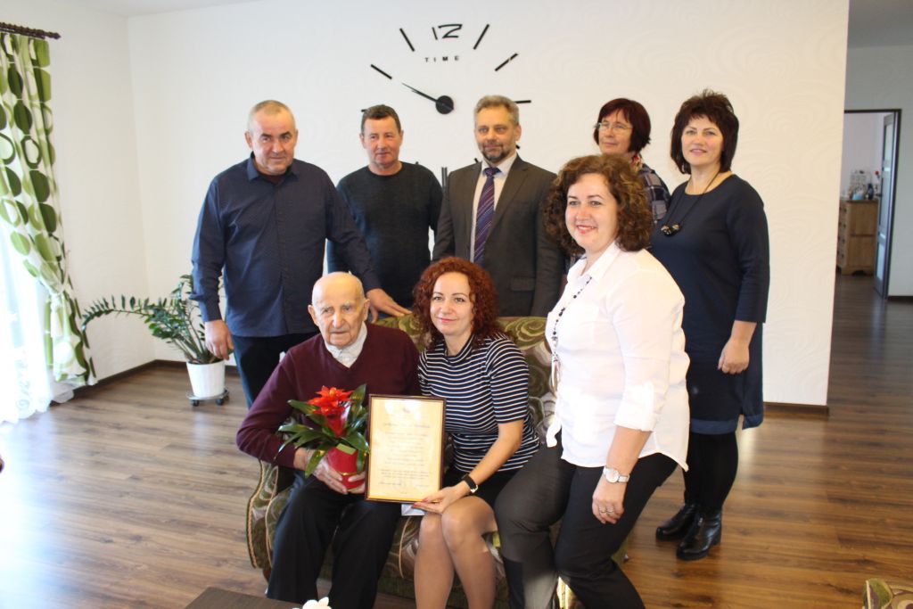 Šilutės rajono savivaldybės Socialinės paramos skyriaus vedėjas Alvidas Šimelionis, Juknaičių seniūnijos socialinio darbo organizatorė Vita Gečienė bei gausus būrys žurnalistų spalio 31-ąją vyko pasveikinti garbingo 90-ojo jubiliejaus sulaukusio juknaitiškio Antano Martinkaus.