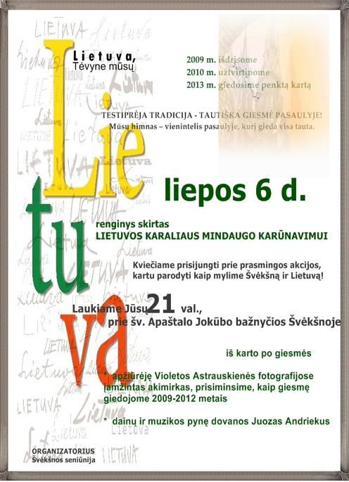 Švėkšniškiai liepos 6 d., 21 val. prie prie Šv. Apaštalo Jokūbo bažnyčios minės Lietuvos karaliaus Mindaugo karūnavimo dieną.