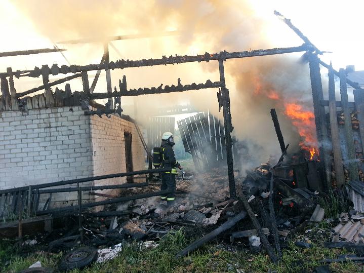 Deja, medinis ūkinis pastatas sudegė. Ugniagesių pastangomis buvo apsaugoti aplinkiniai pastatai.