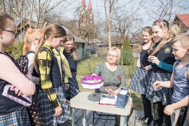 Tradicinių amatų kiemelis buvo suskirstytas į penkias erdves: kūrybiškumo, linksmybių, žinių, poilsio ir fotografijos erdves, kuriuose skambėjo vaikiškos lietuviškos dainos ir mokiniai su dideliu ūpu žaidė žaidimus, sprendė užduotis, margino kiaušinius ir mėgavosi vaišėmis.